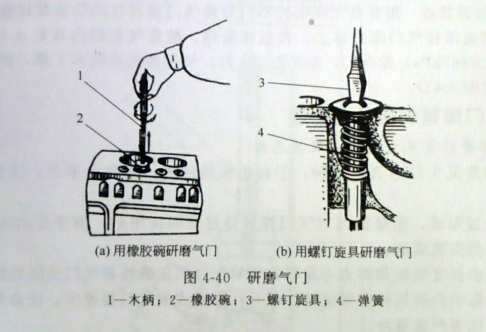 3、用橡膠碗吸住氣門(mén)頭,使柴油發(fā)電機(jī)組氣門(mén)往復(fù)旋轉(zhuǎn)進(jìn)行研磨,如圖4-40(a);若沒(méi)有橡膠碗,氣門(mén)頂有凹槽的,可在氣門(mén)桿上套一根軟彈簧,用螺釘旋具進(jìn)行研磨,如圖4-40(b)。