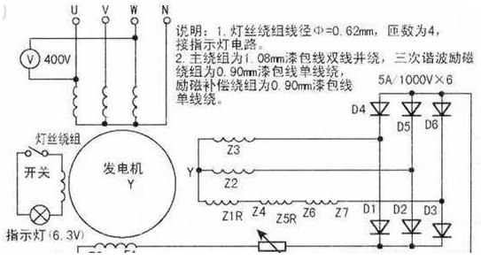 柴油發(fā)電機組實質(zhì)是臺三次諧波自勵磁凸式三相四線同步發(fā)電機,因具有輸出功率大、適合移動等優(yōu)點,故廣泛用于廠礦、工程施工等場合。雖然功率不同的發(fā)電機,其繞組數(shù)據(jù)有所不同,但電路連接基本相同。